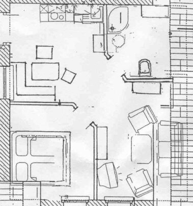 Sie besteht aus einem Wohnraum mit SAT-TV, Radio und CD-Spieler, einem Schlafraum, einem Bad mit Dusche und WC, sowie einem Balkon.